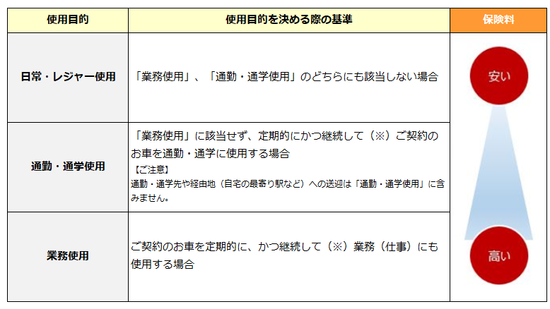 「お車の使用目的」とは、ご契約のお車をどのような目的で使うかによって、当社が定めた区分です。